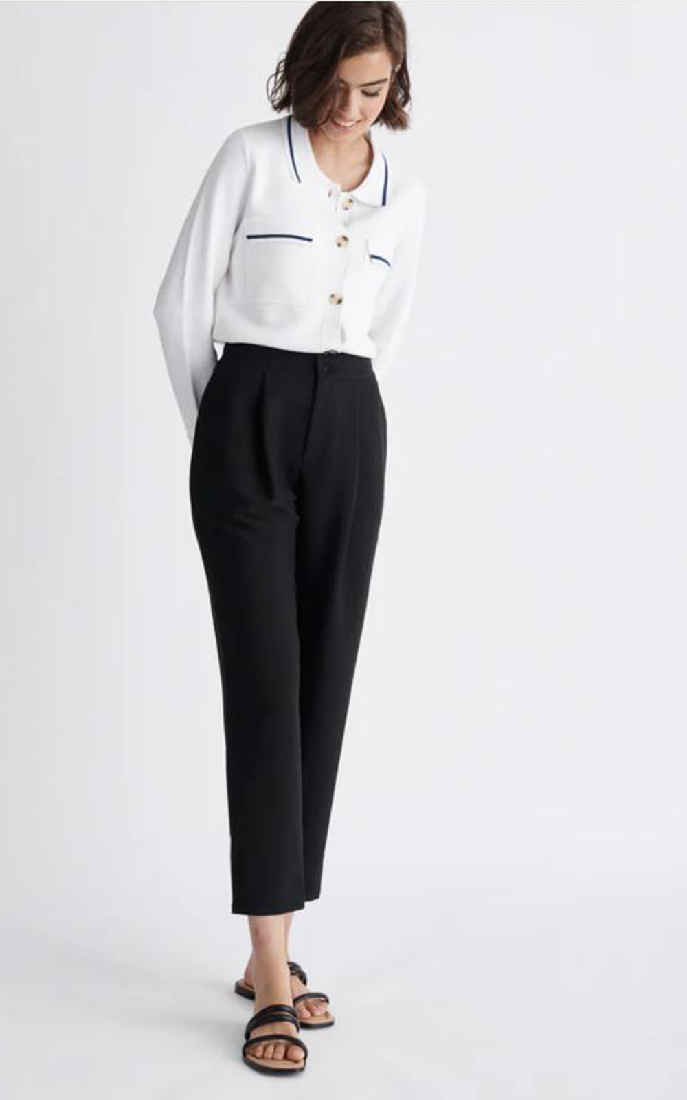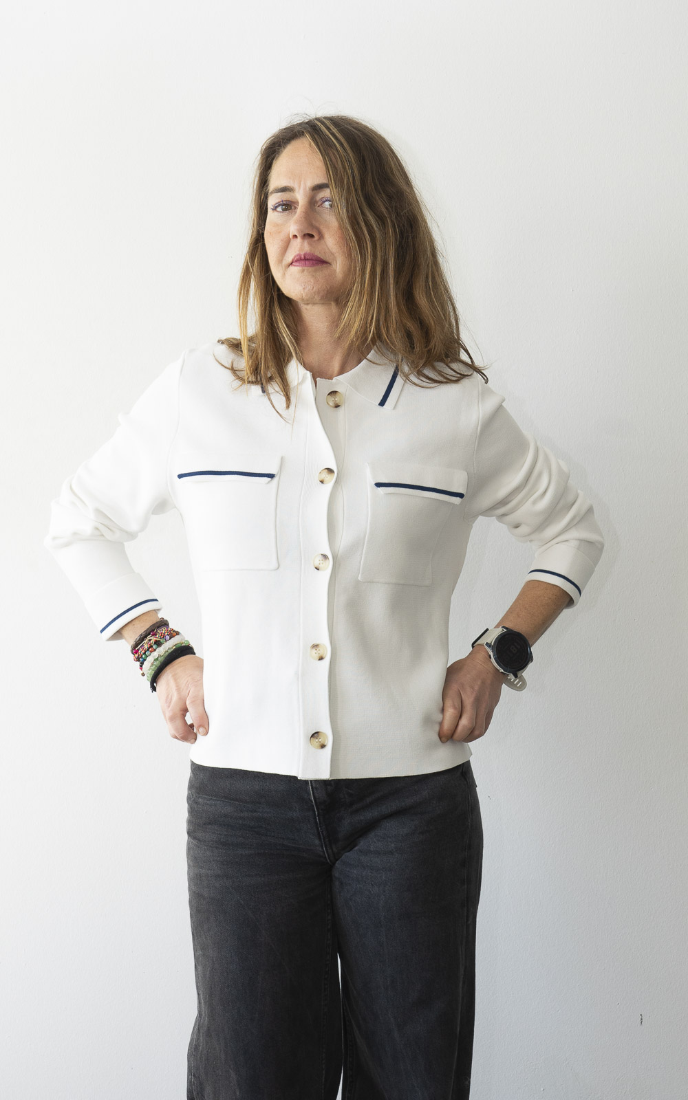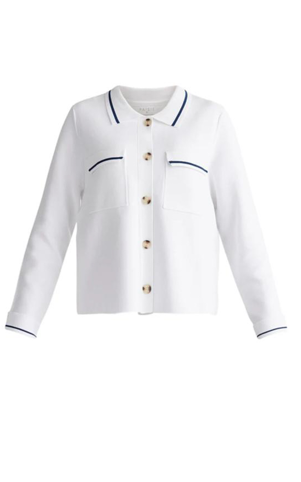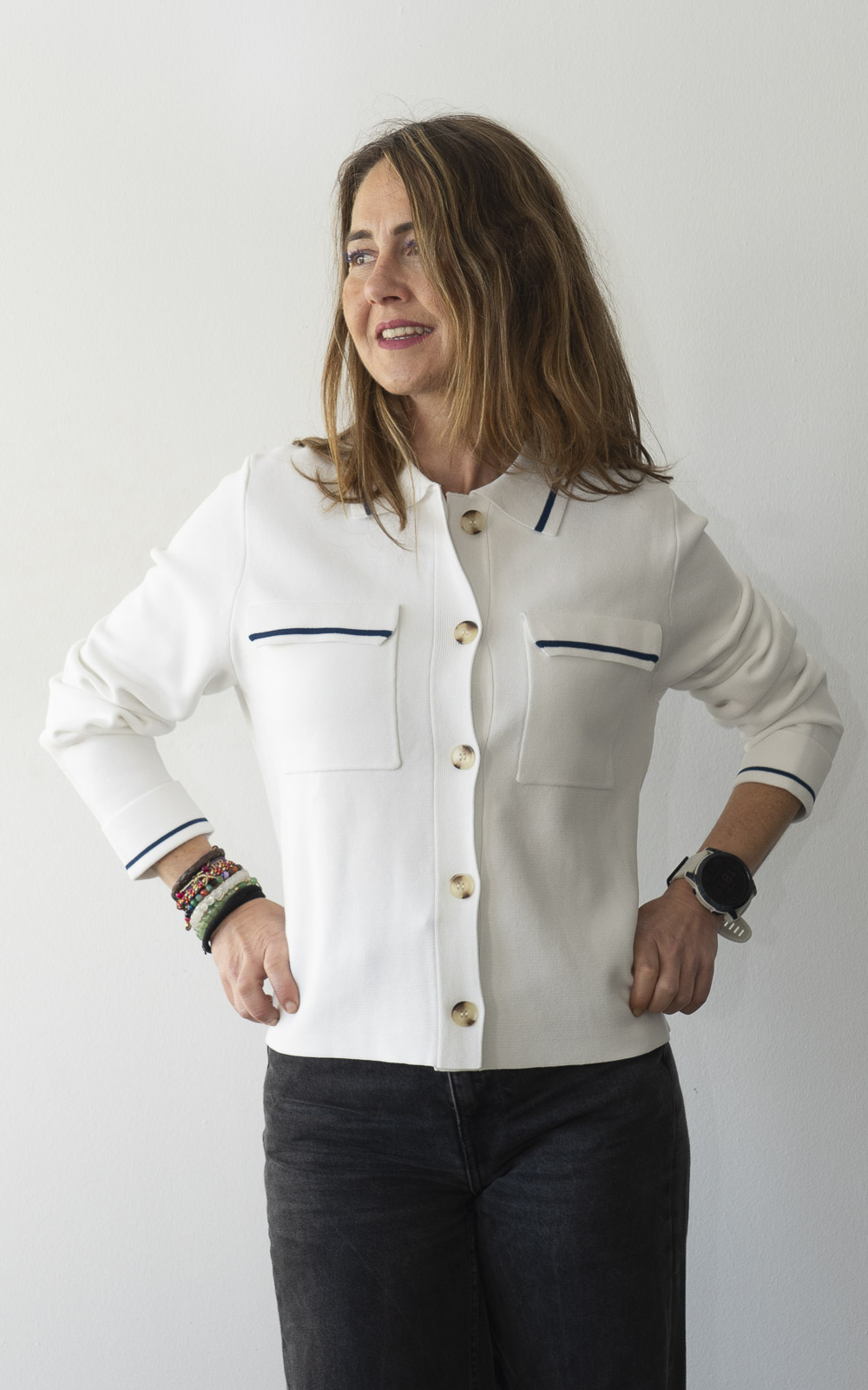 Chaqueta de punto Roma: Elegancia casual en blanco y azul con detalles Chic